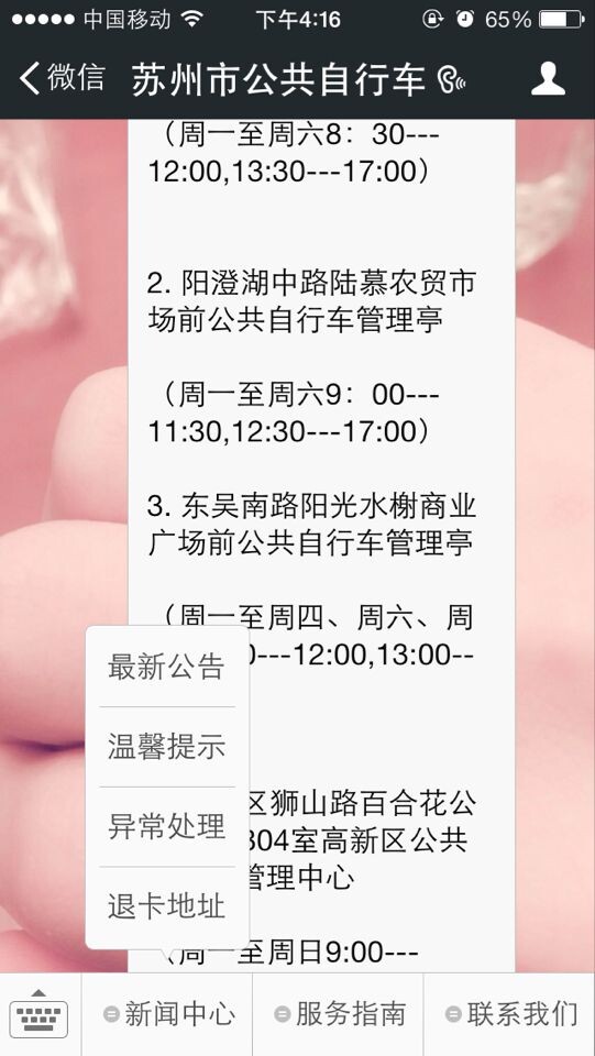 為了更方便市民借還公共自行車,在總公司推出手機(jī)微信快捷查詢之后,現(xiàn)蘇州公共自行車也開通了微信公眾號(hào)。微信號(hào):ggzxc924943037 微信名稱:蘇州市公共自行車。加入蘇州公共自行車微信之后,微信下方會(huì)顯示“新聞中心”、“服務(wù)指南”、“聯(lián)系我們”,如下圖: