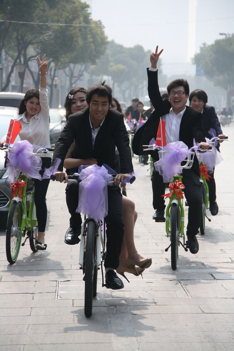 今天上午,專做婚慶活動(dòng)的山東小伙為自己辦了一場(chǎng)低碳而又浪漫的自行車婚禮,20輛草綠色的公共自行車組成了“豪華”車隊(duì),迎娶他那美麗的新娘。