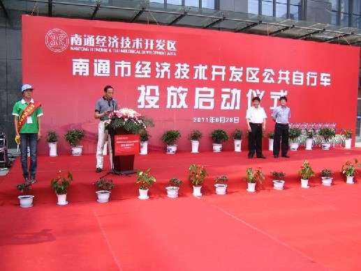 2011年6月28日南通經(jīng)濟(jì)技術(shù)開(kāi)發(fā)區(qū)公共自行車(chē)正式啟動(dòng),啟動(dòng)儀式中管委會(huì)領(lǐng)導(dǎo)介紹了公共自行車(chē)建設(shè)情況,陳書(shū)記宣布公共自行車(chē)系統(tǒng)正式啟動(dòng),并有自行車(chē)騎行方隊(duì)巡游開(kāi)發(fā)區(qū).