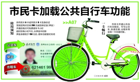 交納押金,就可在姑蘇區(qū)、吳中區(qū)、相城區(qū)、工業(yè)園區(qū)和高新區(qū)借用公共自行車。