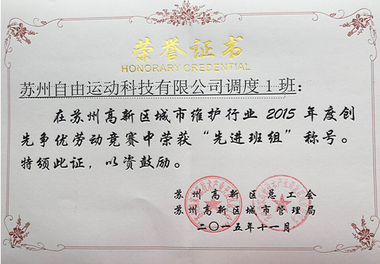2016年1月28日上午,在蘇州高新區(qū)管委會召開了高新區(qū)城市管理年度工作會議。對高新區(qū)城市維護(hù)行業(yè)2015年度創(chuàng)先爭優(yōu)勞動競賽進(jìn)行頒獎。蘇州自由運(yùn)動科技有限公司調(diào)度一班,在勞動競賽中榮獲“先進(jìn)班組”稱號。