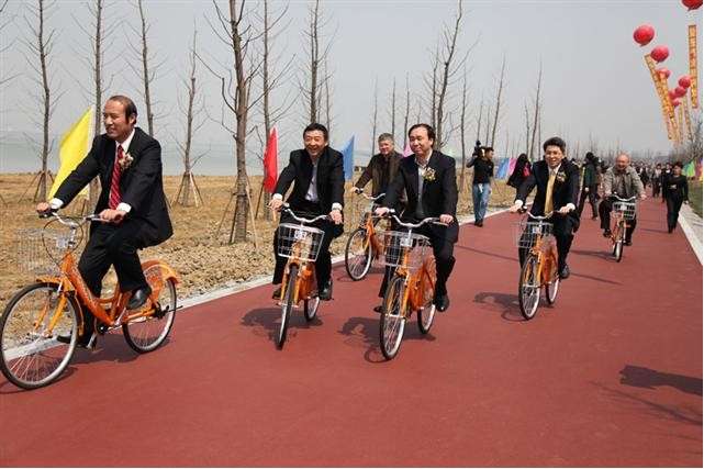 2012年3月26日,環(huán)太湖風景路建設啟動儀式在吳江市與浙江省湖州市吳興區(qū)交界處舉行,參加啟動儀式的國家住建部總工程師陳重、江蘇省副省長何權(quán)、浙江省副省長陳加元等領導在蘇州市副市長吳江市委書記徐明、吳江市代市長梁一波的陪同下,到吳江濱湖新城生態(tài)公園體驗公共自行車。