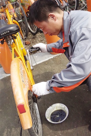 “這個雨水泡久了,銹了,得擦點油。”維修工顧師傅告訴記者,公共自行車最容易損壞的是車鈴、剎車和坐墊。除了個別人為破壞外,大多數(shù)都是因為使用的次數(shù)多了,如不及時更換,就會影響車的性能。說話間,他又發(fā)現(xiàn)一個車墊升降零件壞了,擦了油,試了幾次還是不行,只能更換。