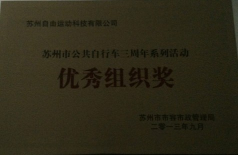 為倡導(dǎo)“低碳生活,綠色出行”理念,進(jìn)一步鞏固和提升我市公共自行車服務(wù)與管理水平,按照我市開展無車日活動(dòng)工作的統(tǒng)一部署,結(jié)合《“綠色蘇州夢 我們在行動(dòng)” 蘇州公共自行車啟用三周年系列活動(dòng)方案》,蘇州市市容市政管理局于2013年4月---9月開展了蘇州市公共自行車啟用三周年系列活動(dòng)。在各級部門的廣泛發(fā)動(dòng)和認(rèn)真組織下,活動(dòng)取得了圓滿成功。本次活動(dòng)得到了社會(huì)各方的關(guān)心和支持,也得到了市民群眾的熱烈響應(yīng)和參與積極,有效傳播了“綠色出行”理念和公共自行車文化,取得了良好的社會(huì)效果。在此次活動(dòng)中我公司被授予“優(yōu)秀組織獎(jiǎng)”的榮譽(yù)稱號。