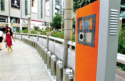 位于聯(lián)合廣場東側(cè)的大南門世貿(mào)大廈服務(wù)點(diǎn),是10個已建成的服務(wù)點(diǎn)之一。記者看到,這一服務(wù)點(diǎn)由一個橘黃色的控制器和20個鎖止器組成??刂破飨駛€大柜子,上面有刷卡區(qū)、按鍵區(qū)及顯示屏,可供市民查詢借車卡余額、附近服務(wù)點(diǎn)空位等信息。而鎖止器像一個樁子,實(shí)行每車一“樁”,頂部有刷卡區(qū)及車鎖,市民借車、還車時,借車卡都要觸碰“樁”上的刷卡區(qū)。據(jù)悉,一輛公共自行車造價為500元,而一個鎖止器的價格為1400多元,一個控制柜的價格為5000多元。