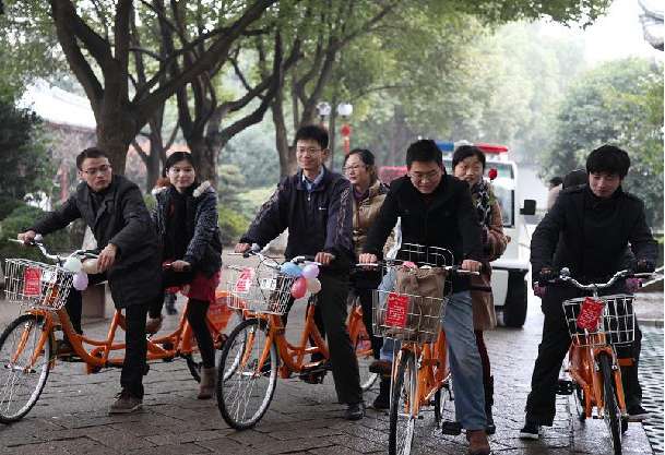 2月14日,吳江推出雙人公共自行車,分別投放于吳江公園和蘇州河,由于恰逢西方情人節(jié),所以借此機(jī)會(huì),在吳江公園內(nèi)舉辦了“情侶同騎雙人公共自行車”的活動(dòng)。12點(diǎn)58分活動(dòng)按時(shí)進(jìn)行,雖然陰雨蒙蒙,但經(jīng)過的情侶都會(huì)停下來看看這"稀罕"的雙人公共自行車,在工作人員的鼓勵(lì)下,情侶們紛紛踏著雙人自行車?yán)@著公園騎了起來。另外,只要試騎雙人公共自行車的情侶都可以領(lǐng)取工作人員準(zhǔn)備的玫瑰花和巧克力。