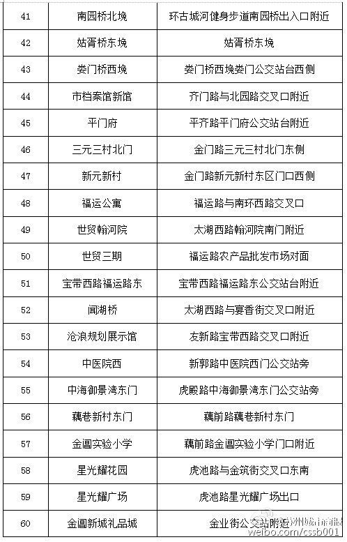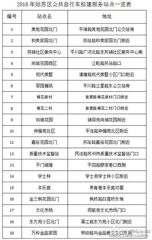 姑蘇區(qū)公共自行車(chē)服務(wù)網(wǎng)點(diǎn)擬定2016年新建70個(gè),計(jì)劃投放公共自行車(chē)2000輛?,F(xiàn)將前期60個(gè)站點(diǎn)予以公示。公示時(shí)間4月18日-4月25日,如有意見(jiàn)或建議可通過(guò)電話、郵件及12345便民熱線等方式向市市容市政管理局反映。電子郵件:szbicycle@126.com;市數(shù)字城管:0512-69331110;其他方式:12345便民熱線 寒山聞鐘論壇。