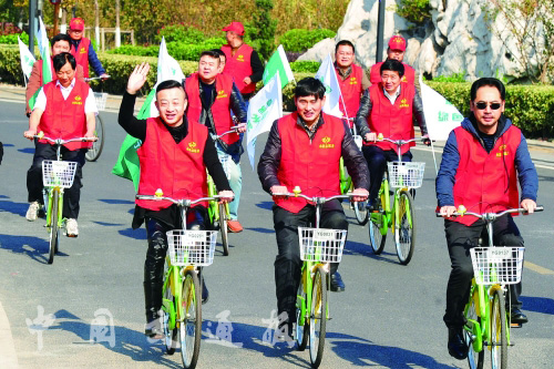日前,江蘇省張家港市永聯(lián)村公共自行車系統(tǒng)投入使用,村域面積為10.5平方公里、被稱為“華夏第一鋼村”的永聯(lián)村成為全國(guó)首個(gè)啟用公共自行車系統(tǒng)的建制村。一些明星也來(lái)到村里騎行公共自行車,共同宣傳低碳環(huán)保的出行理念(如圖)。永聯(lián)村公共自行車一期設(shè)立17個(gè)租借點(diǎn),安裝鎖車器500個(gè),投放公共自行車400輛。